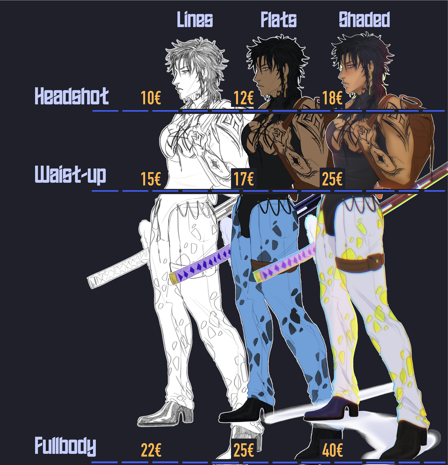 -Arguing prices or asking for discounts will result in an immediate blacklisting.--------------------------------If you would like to know my experience with commissions or examples of ones I've done, I can provide that.